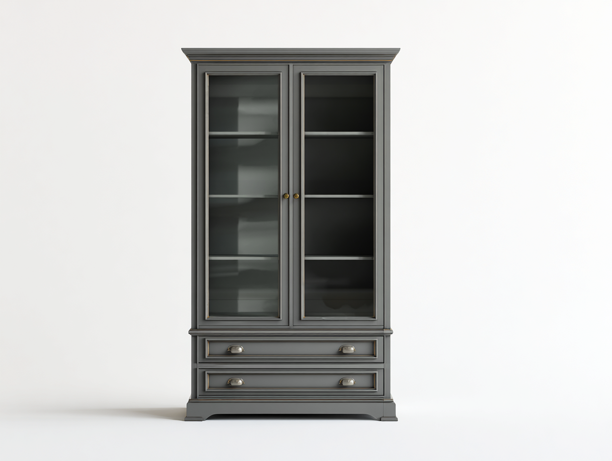 Die verglasten Türen ermöglichen eine übersichtliche Präsentation von Geschirr oder dekorativen Gegenständen. Der untere Bereich bietet zusätzlichen Stauraum für Alltagsgegenstände und unterstützt eine geordnete Organisation im Wohnraum.