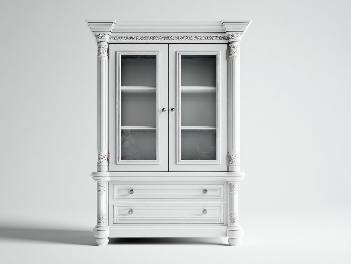 Diese Vitrinen im klassischen Stil bieten eine elegante Möglichkeit zur Präsentation von Geschirr, Glaswaren oder dekorativen Gegenständen. Die Kombination aus verglasten Türen und geschlossenem Stauraum sorgt für eine harmonische Verbindung zwischen Präsentation und Aufbewahrung. Das zeitlose Design passt besonders gut in Wohn- oder Essbereiche und fügt sich harmonisch in klassische Einrichtungen ein.